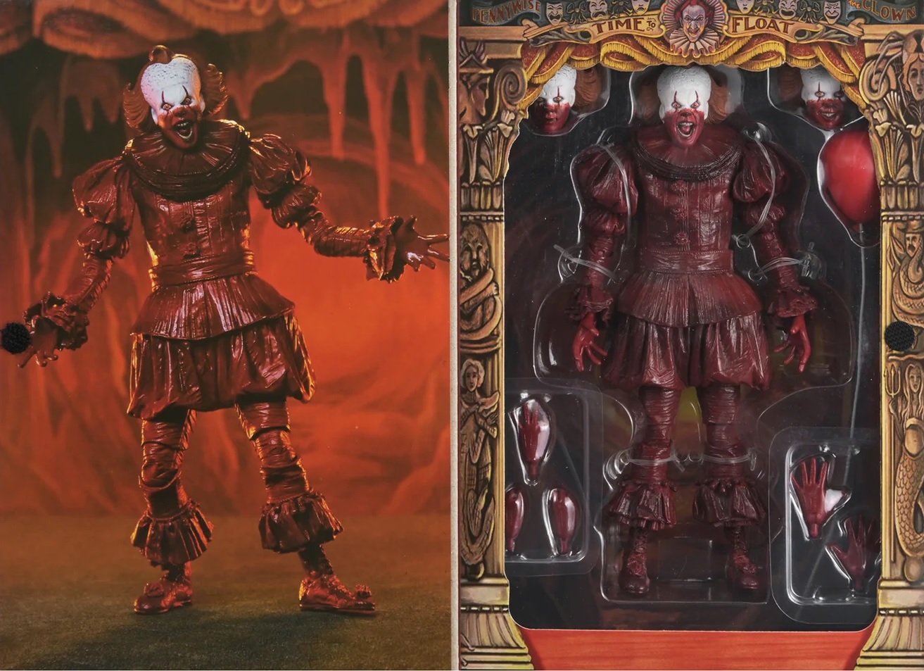 Die Figur steht rund 18 cm (7″) groß und kommt mit vollem Gelenkumfang, der verschiedene dynamische Posen ermöglicht. Das auffälligste Merkmal ist die blutverschmierte Bemalung, die Pennywise in seinem berüchtigten Look aus dem Staffelfinale zeigt. Zum Lieferumfang gehören austauschbare Köpfe und Hände, sodass Sammler unterschiedliche Ausdrücke und Szenen auf ihrem Regal nachstellen können. Die Figur kommt in einer sammlerfreundlichen Fensterbox mit aufklappbarer Front.