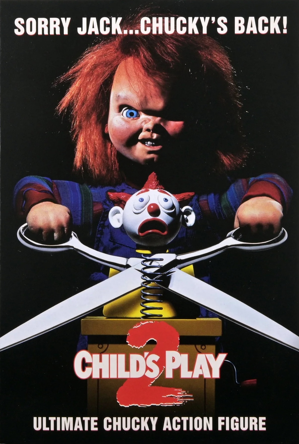 - Die Fabrik-Sequenz am Ende von Child’s Play 2, in der Chucky von einem Fließband mit Good Guy Puppen umgeben ist, gilt in der Horrorfilm-Community als eine der stärksten Schlusssequenzen des Genres, genau dieses Setting spiegelt sich in mehreren Accessoires dieser Figur wider, darunter die Schere und der Springteufel direkt vom Filmplakat.