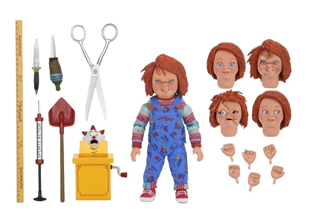 - Zubehör: 5 Wechselköpfe, mehrere Wechselhände, alternativer Unterarm mit Messerklinge, Lineal, Luftpumpe, Messer, Good Guy Schaufel, übergroße Schere, Springteufel, maßstabsgetreue Child’s Play 2 Good Guy Verpackungsbox